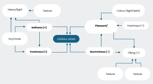 - Edges: Arrows showing the direction of influence – if one factor affects another, it’s clearly mapped. For example, if softness leads to higher liking, the model shows that link explicitly.